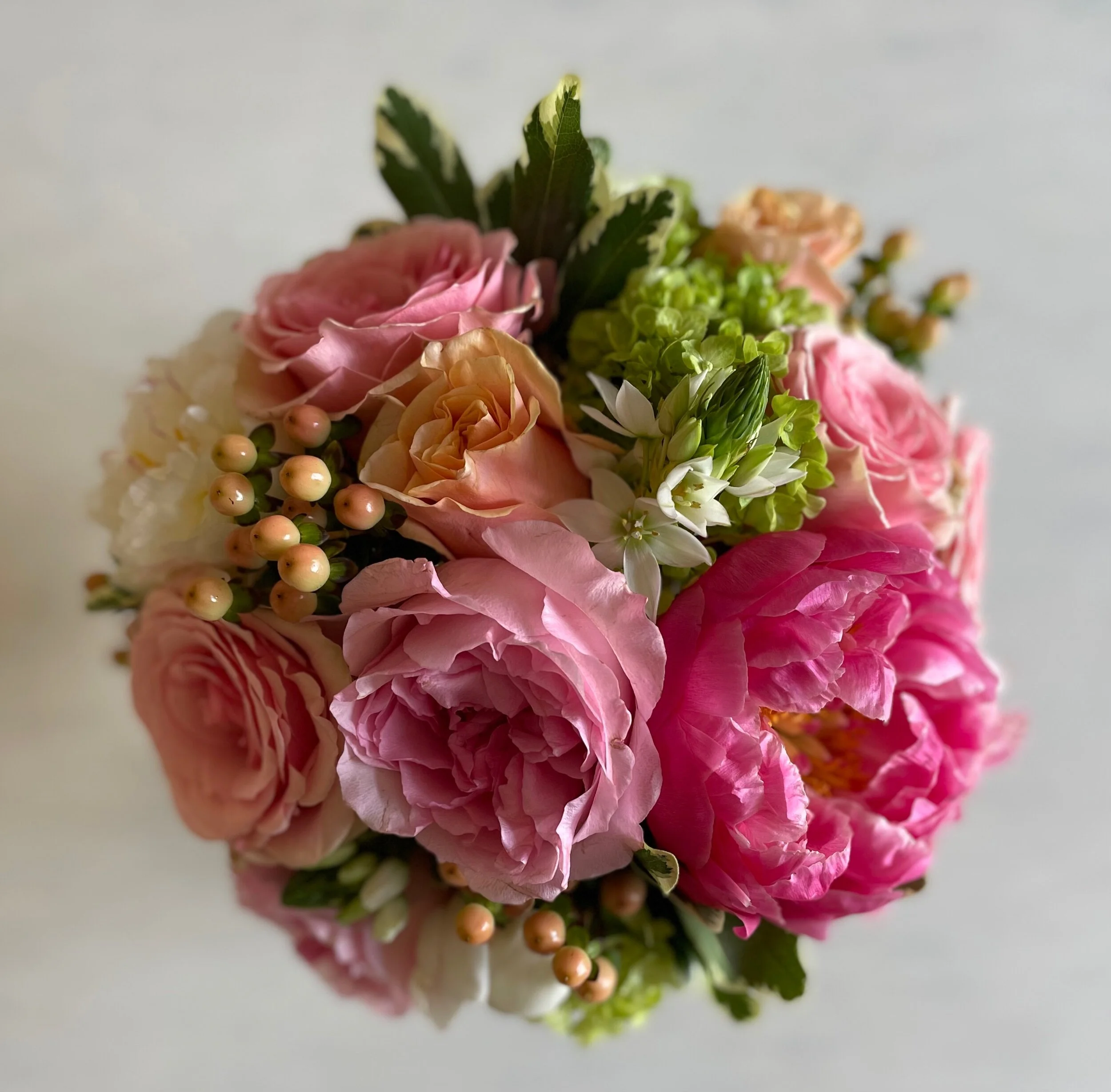 Fresh flowers in a medium glass vase with a handwritten card. A curated mix of seasonal blooms in the soft, shades of springtime, perfectly prepared for a desk or dining table.